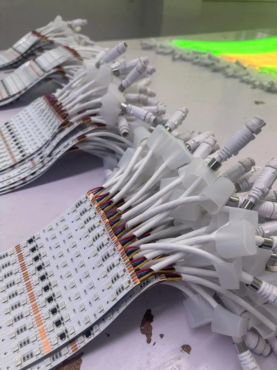 Once the subcomponents are built, it’s time for assembly. LED ribbons are coiled and prepped. Pixel strings are bundled into neat clusters. Connectors are crimped and tested, one by one, to ensure reliability. The repetitive, wave-like lines of light products stretching across a workbench look almost sculptural.